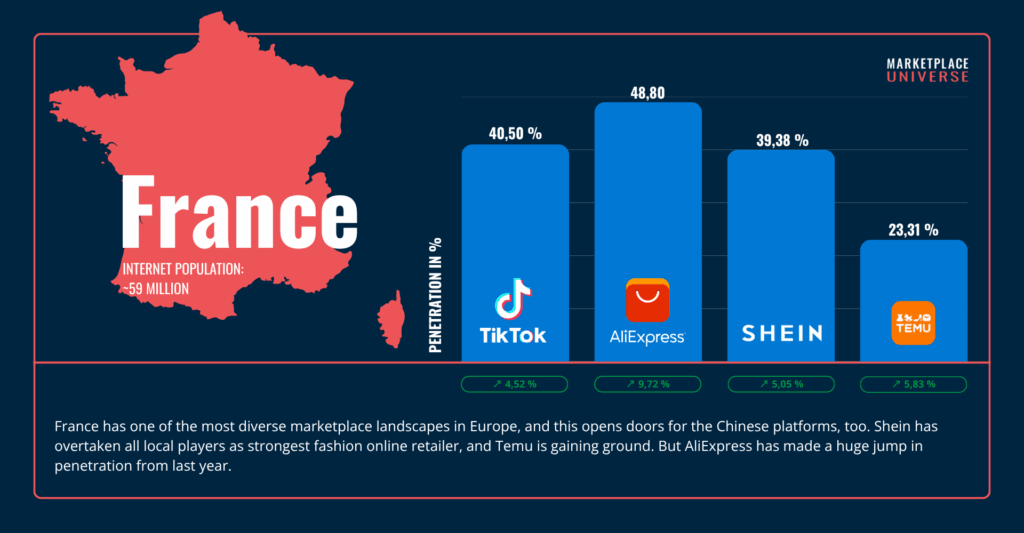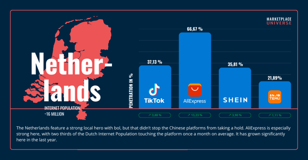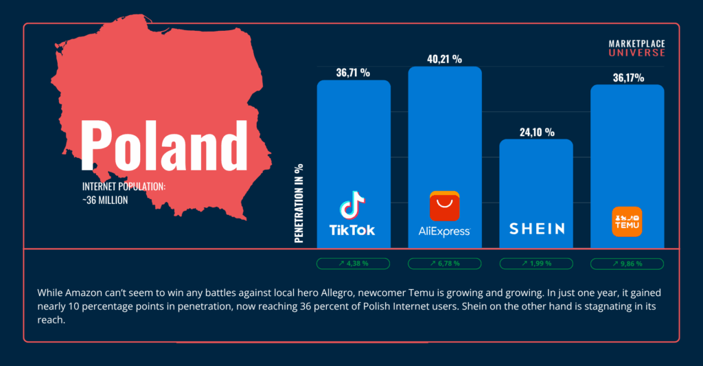 Poland is witnessing a Chinese platform boom, led by Temu, with strong contributions from AliExpress and Shein. The country’s lower Amazon penetration creates a clear opening for newcomers.