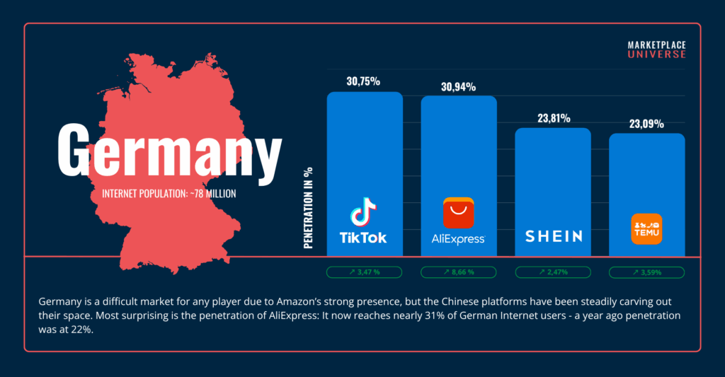 Discover how Amazon’s dominance in Europe is being challenged by Chinese platforms like AliExpress, Shein, and Temu. Explore platform penetration, growth, and regional trends in 2025.