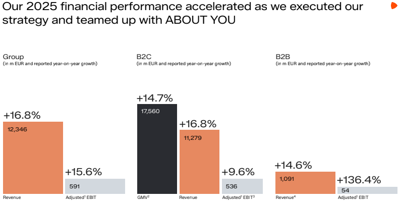 One of the most relevant metrics is the Partner Program share (32%) of B2C GMV. Compared to 34.3% in 2024, this appears to be a decline. However, the integration of ABOUT YOU plays an important role, as the group average is mechanically diluted.